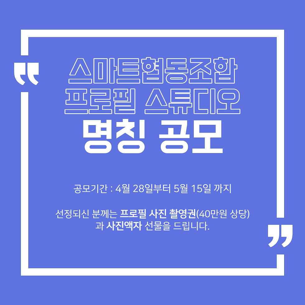 프로필 스튜디오 명칭 공모ksen2562021년 4월 28일1분 분량한국스마트협동조합에서는 예술인을 전문으로 촬영하는 스튜디오를 준비 중에 있습니다. 오랜 기간 준비를 마치고 이제 정식으로 아티스트 프로필 스튜디오의 오픈을 앞두고 있습니다. 런칭에 앞서 조합원 분들께 스튜디오의 이름을 제안받고자 합니다. 형식에 제한 없이 자유롭게 아이디어를 공유해주시면 감사하겠습니다.공모기간 : 4월 28일부터 5월 15일까지참여신청 : https://forms.gle/d1GwYeTwXRGGKiqg7